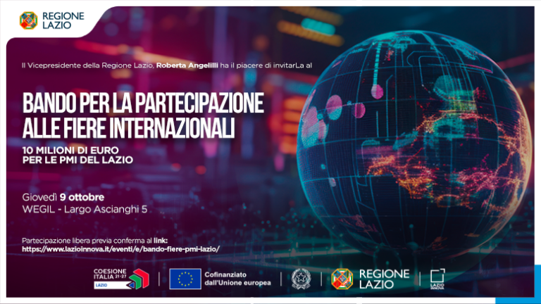 Il Vicepresidente della Regione Lazio Roberta Angelilli ha il piacere di invitarla alla presentazione del nuovo Bando per la partecipazione alle fiere internazionali, cofinanziato dal PR FESR Lazio 2021-2027, che stanzia 10 milioni di euro per favorire l’internazionalizzazione delle PMI del Lazio.